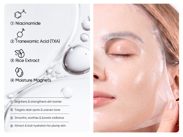 Formulated with Niacinamide, Tranexamic Acid, and Rice Extract, this mask helps brighten dull skin, improve uneven skin tone, and leave skin looking fresh, plump, and naturally radiant.