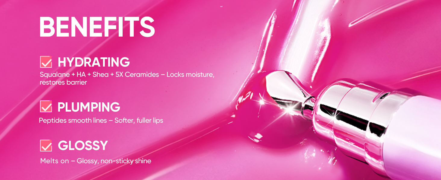 ☑︎ Hydrating ☑︎ Plumping ☑︎ Glossy