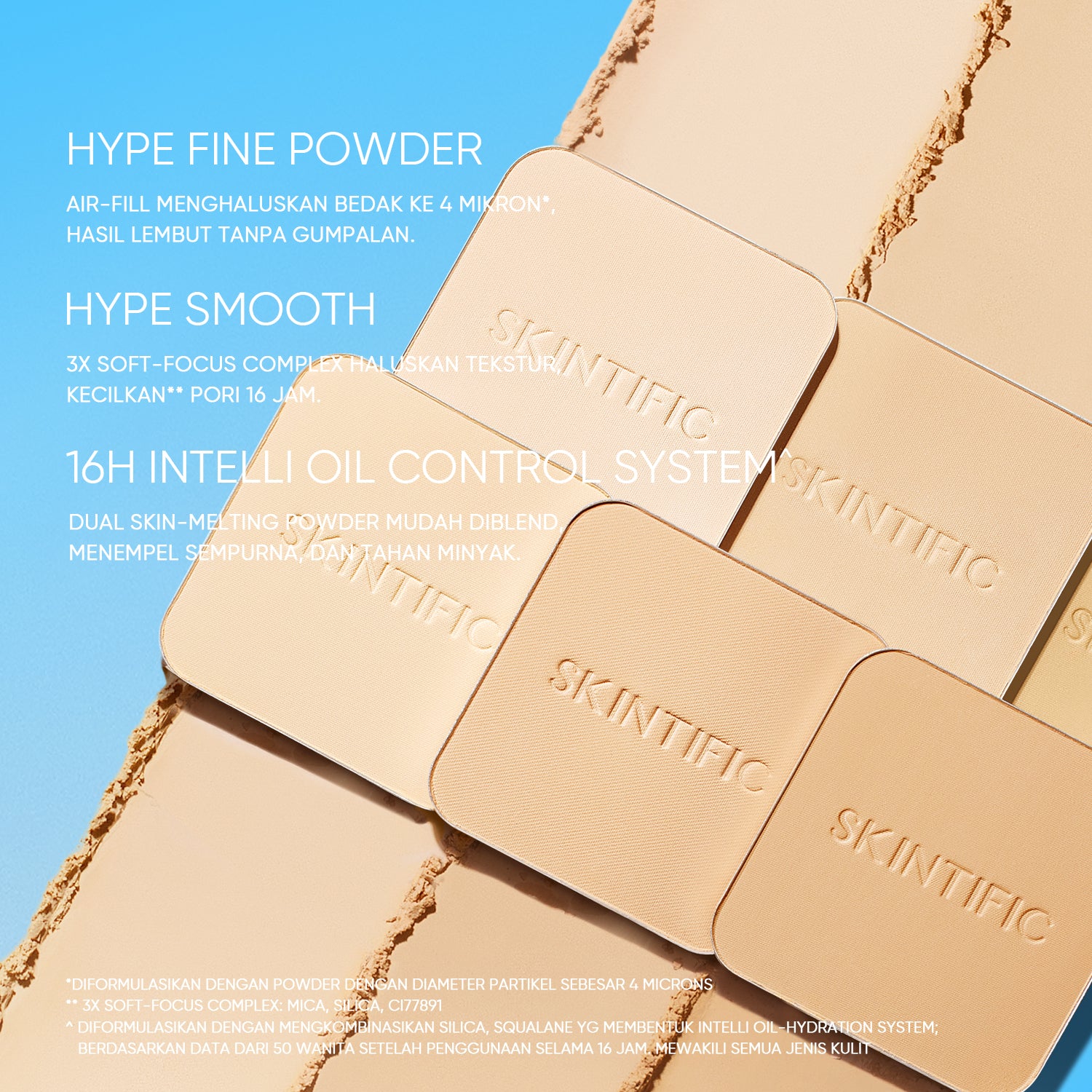 Hype Fine Powder and Soft-Focus Complex create a flawless, poreless look without caking.